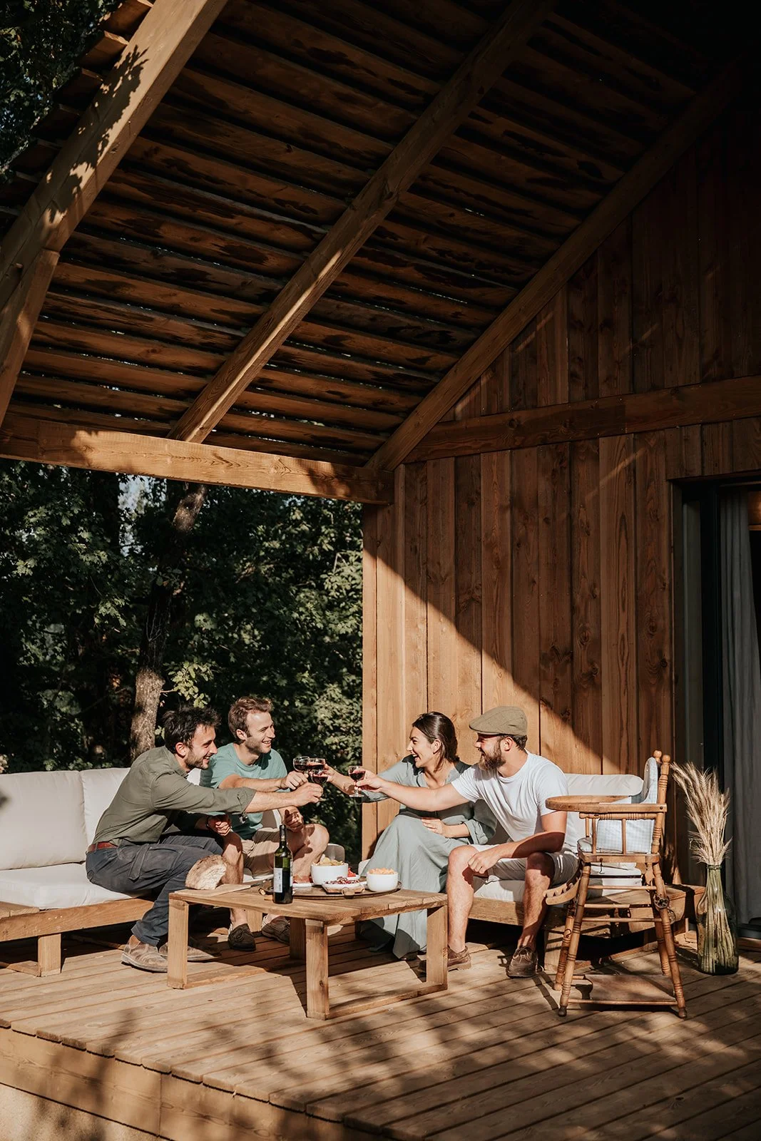 Tout autour du corps de ferme, vous trouverez quatre lieux, 55 maisons en bois dispersées sur 6 hectares et pouvant accueillir chacune jusqu’à 6 personnes. Les hébergements ont été réalisés par un charpentier compagnon du devoir à seulement 10km du site.